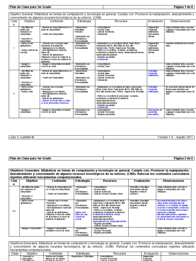 Plan de Clase de Computación 1er Grado