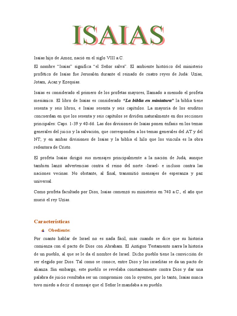 El documento resume la vida y obra del profeta Isaías, quien vivió en el siglo VIII a.C. en Jerusalén durante el reinado de cuatro reyes de Judá. Isaías es considerado el primero de los profetas mayores y transmitió mensajes de juicio, salvación y esperanza universal a Judá e incluso a naciones vecinas. Su libro se divide en dos secciones que enfatizan estos temas y vinculan todo a la obra redentora de Cristo.