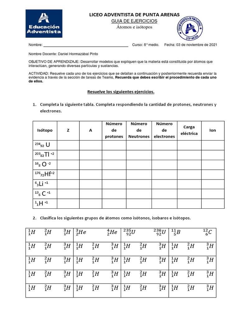 1. Completa la siguiente tabla. Completa respondiendo la cantidad de protones, neutrones y