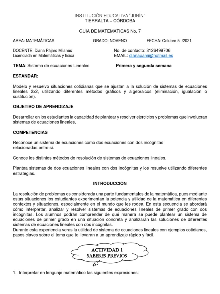 TEMA: Sistema de ecuaciones Lineales Primera y segunda semana