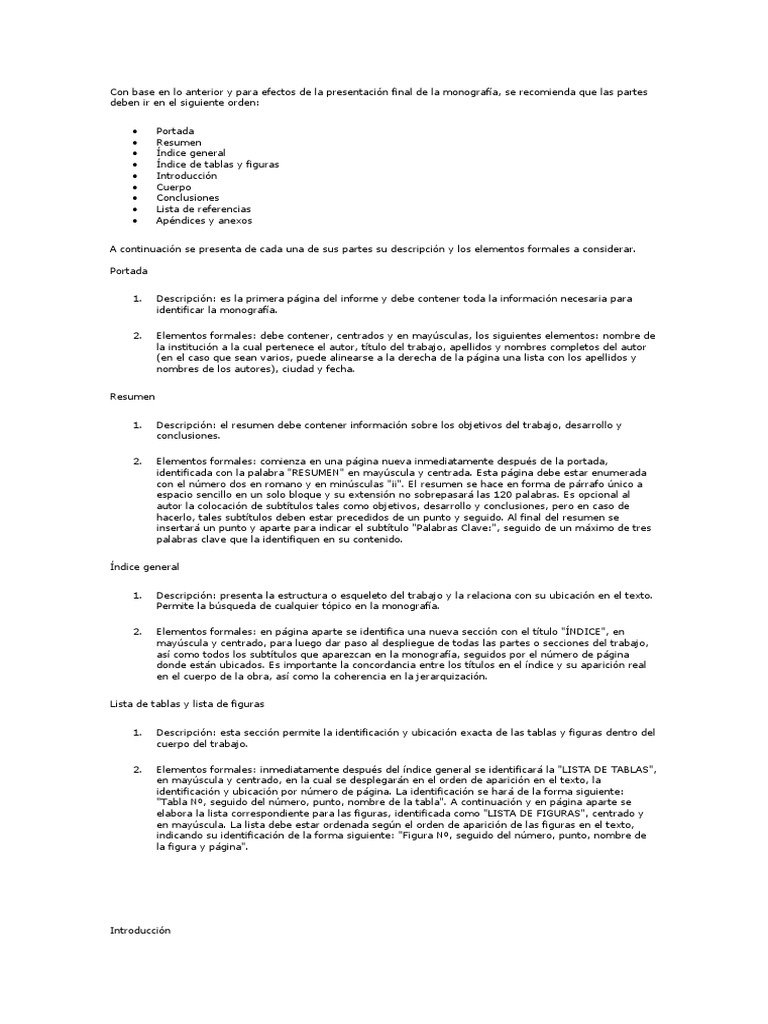 Con base en lo anterior y para efectos de la presentación final de la monografía, se recomienda que las partes