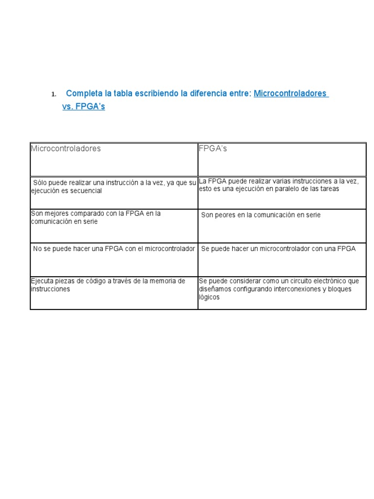 Completa la tabla escribiendo la diferencia entre: Microcontroladores