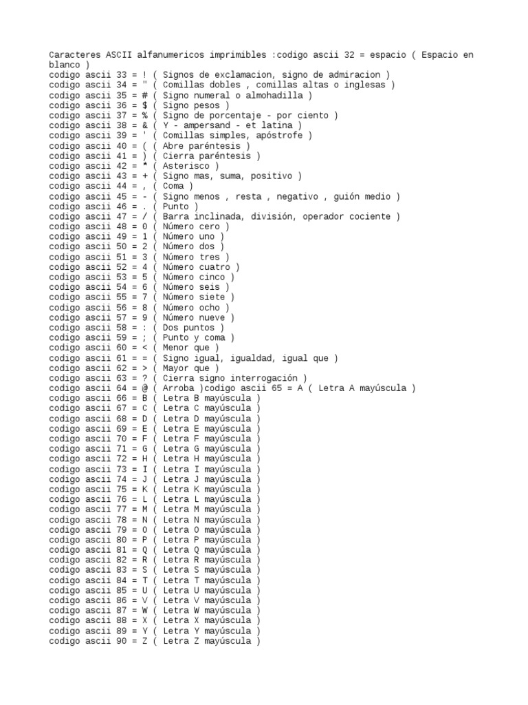 Caracteres ASCII alfanumericos imprimibles :codigo ascii 32 = espacio ( Espacio en