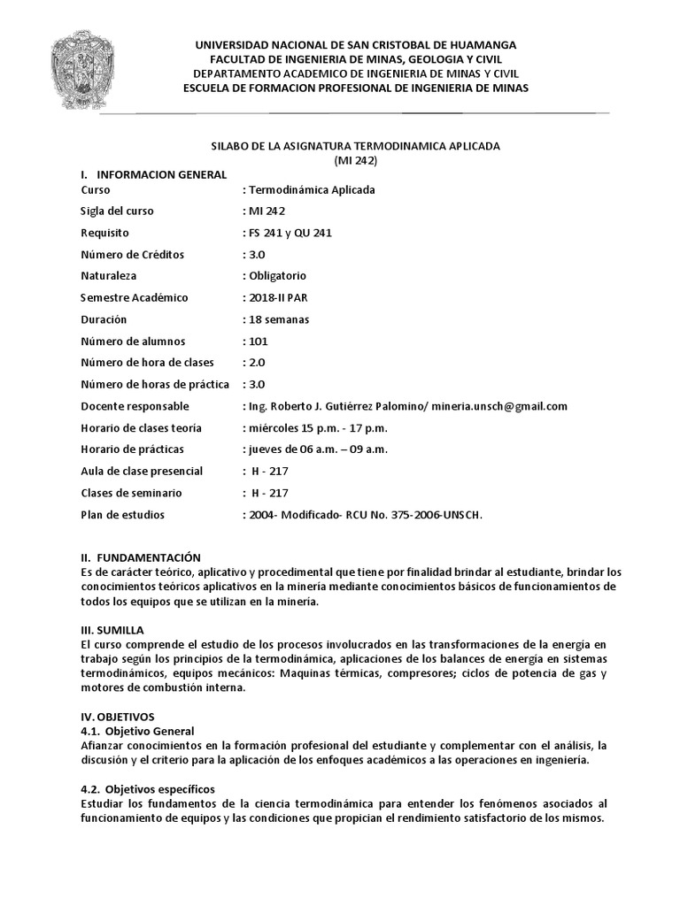SILABO DE LA ASIGNATURA TERMODINAMICA APLICADA