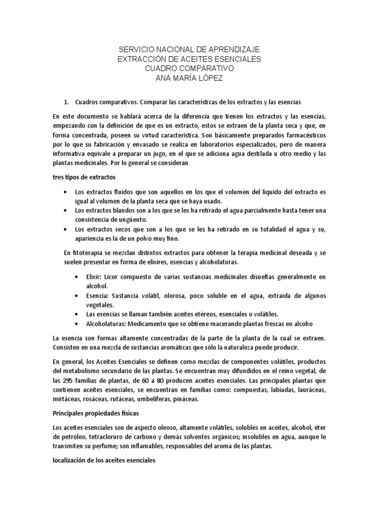 1. Cuadros comparativos. Comparar las características de los extractos y las esencias