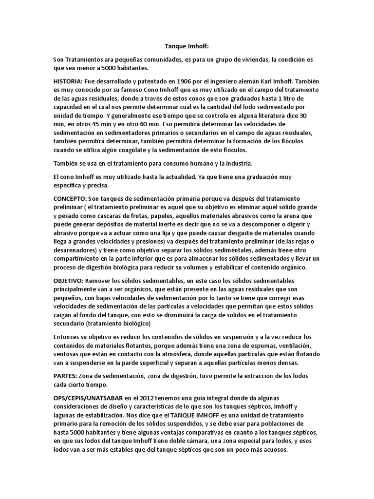 lagunas de estabilización. Nos dice que el TANQUE IMHOFF es una unidad de tratamiento