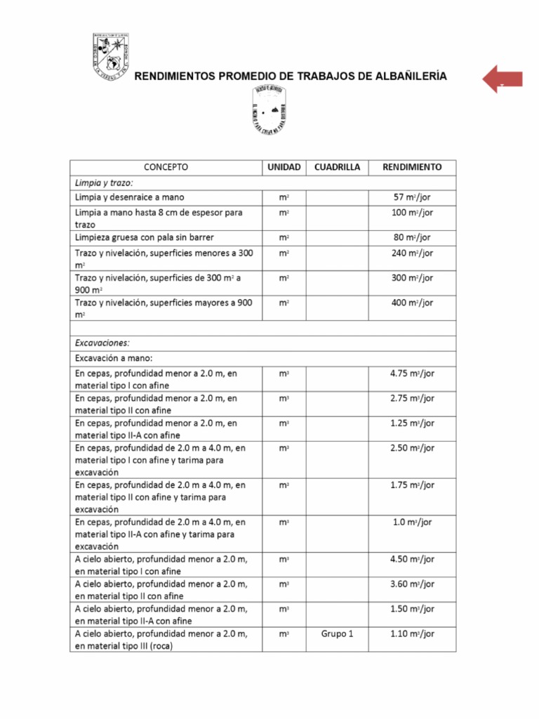 RENDIMIENTOS PROMEDIO DE TRABAJOS DE ALBAÑILERÍA