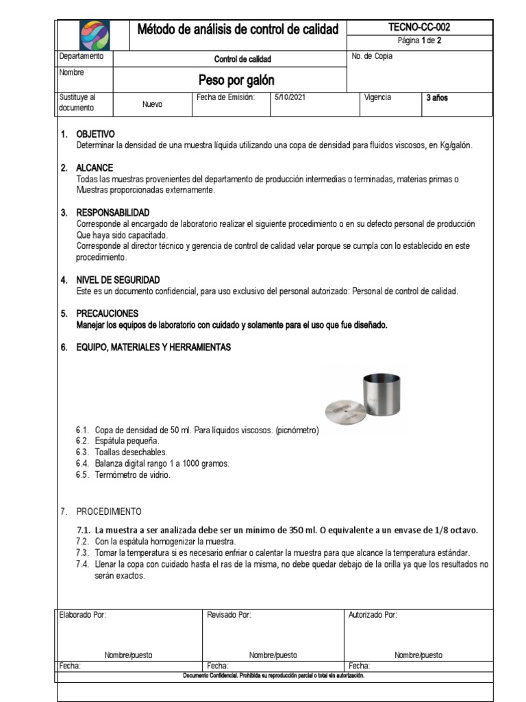 Determinar la densidad de una muestra líquida utilizando una copa de densidad para fluidos viscosos, en Kg/galón.