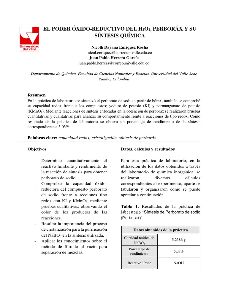 Palabras clave: capacidad redox, cristalización, síntesis de perboráx