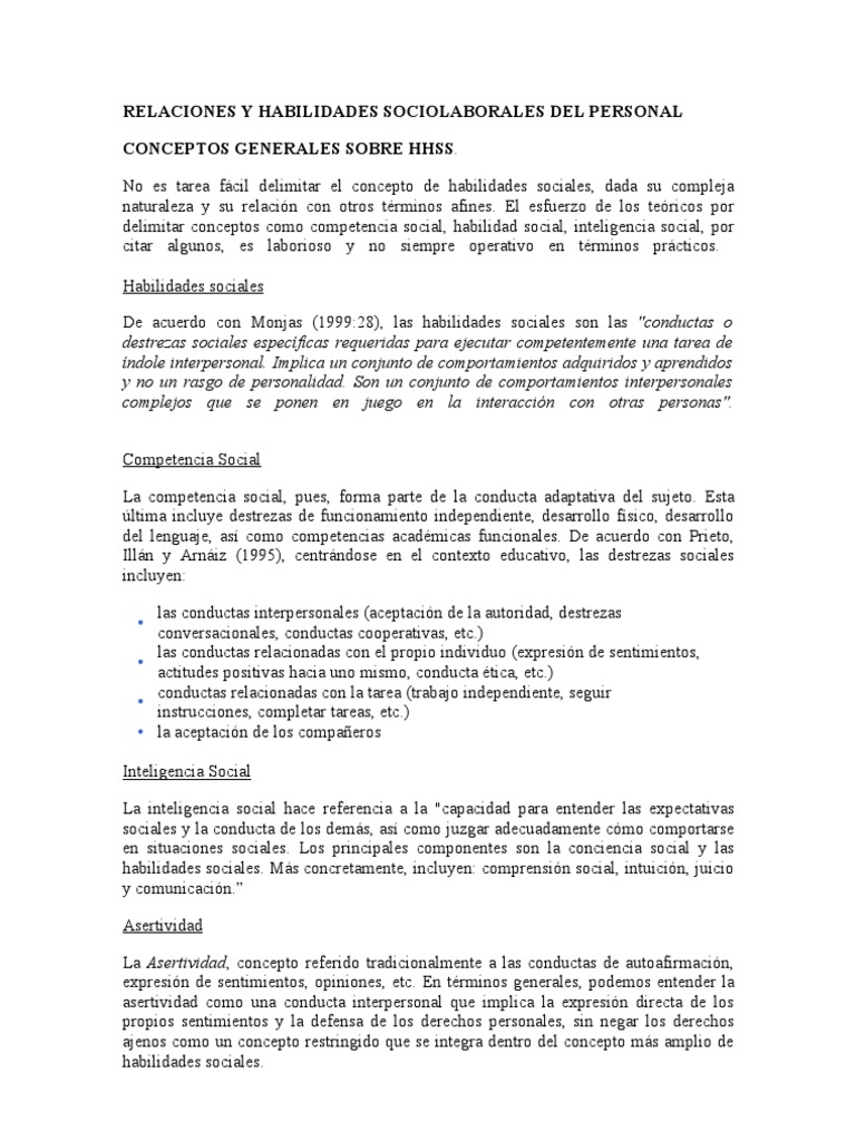 De acuerdo con Monjas (1999:28), las habilidades sociales son las "conductas o