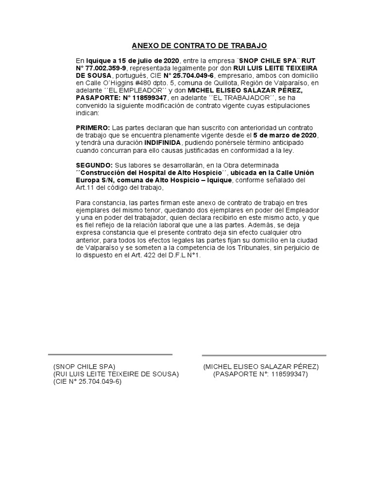 En Iquique a 15 de julio de 2020, entre la empresa ¨SNOP CHILE SPA¨ RUT