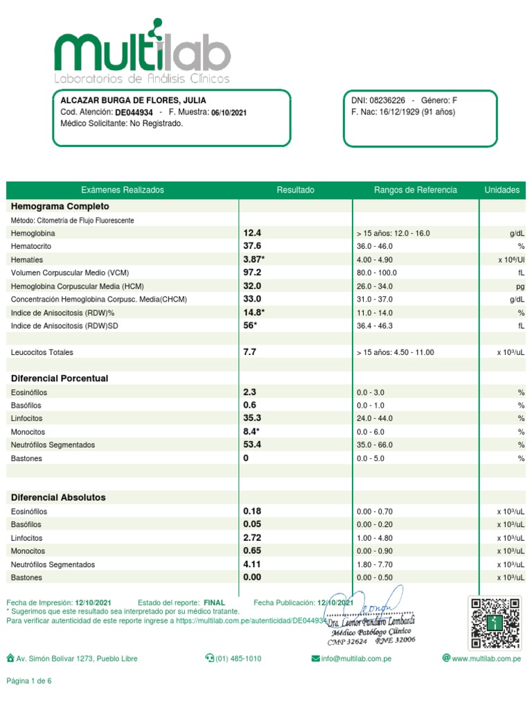 Cod. Atención: DE044934 - F. Muestra: 06/10/2021 F. Nac: 16/12/1929 (91 años)