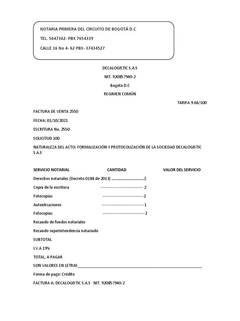 FACTURA A: DECALOGISTIC S.A.S NIT. 920857940-2