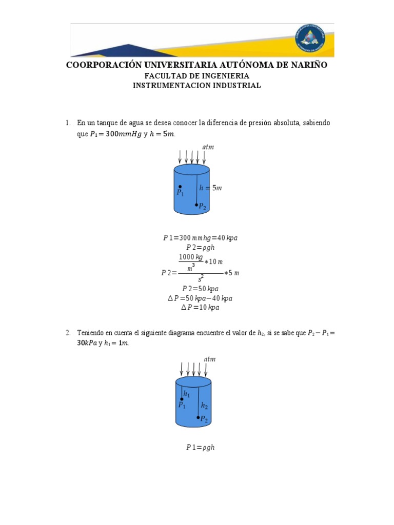 1. En un tanque de agua se desea conocer la diferencia de presión absoluta, sabiendo
