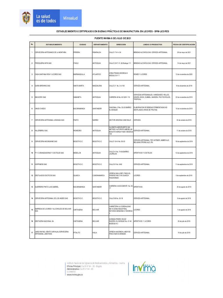 ESTABLECIMIENTOS CERTIFICADOS EN BUENAS PRÁCTICAS DE MANUFACTURA EN LICORES - BPM-LICORES