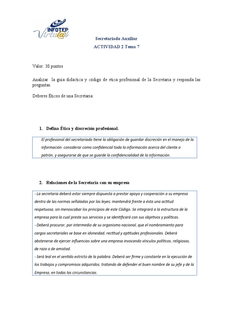 Analizar la guía didáctica y código de ética profesional de la Secretaria y responda las