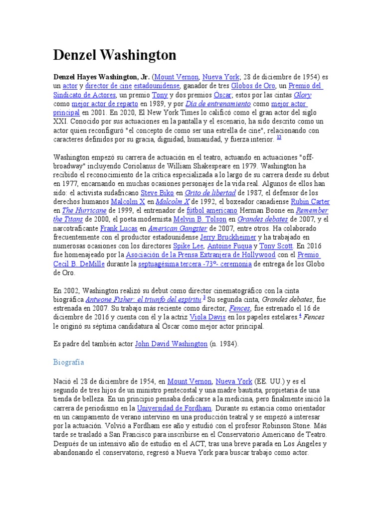 Denzel Washington es un actor estadounidense, hijo de un predicador protestante llamado