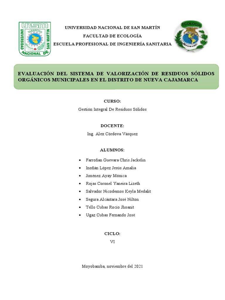 Valorización de Residuos Municipales en el distrito de Nueva Cajamarca; siendo