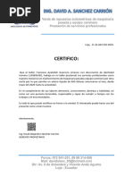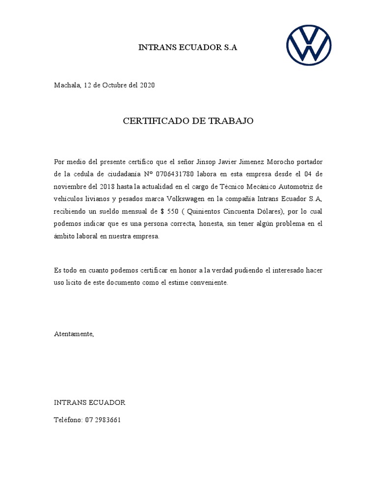 Este certificado confirma que Jinsop Javier Jimenez Morocho ha trabajado como Técnico Mecánico Automotriz para vehículos livianos y pesados de la marca Volkswagen en Intrans Ecuador S.A. desde noviembre de 2018. Recibe un sueldo mensual de $550 y se describe como una persona honesta y sin problemas en el trabajo. El certificado puede ser usado legalmente por el interesado.