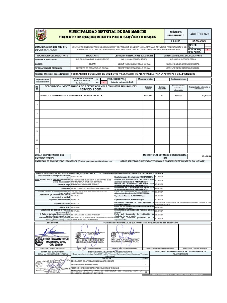 técnico, plan de trabajo u otro: Y RURAL N°020-2020-MDSM/GDUR/G requerimiento: