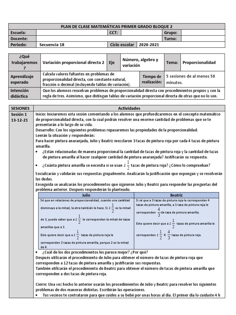 PLAN DE CLASE MATEMÁTICAS PRIMER GRADO BLOQUE 2