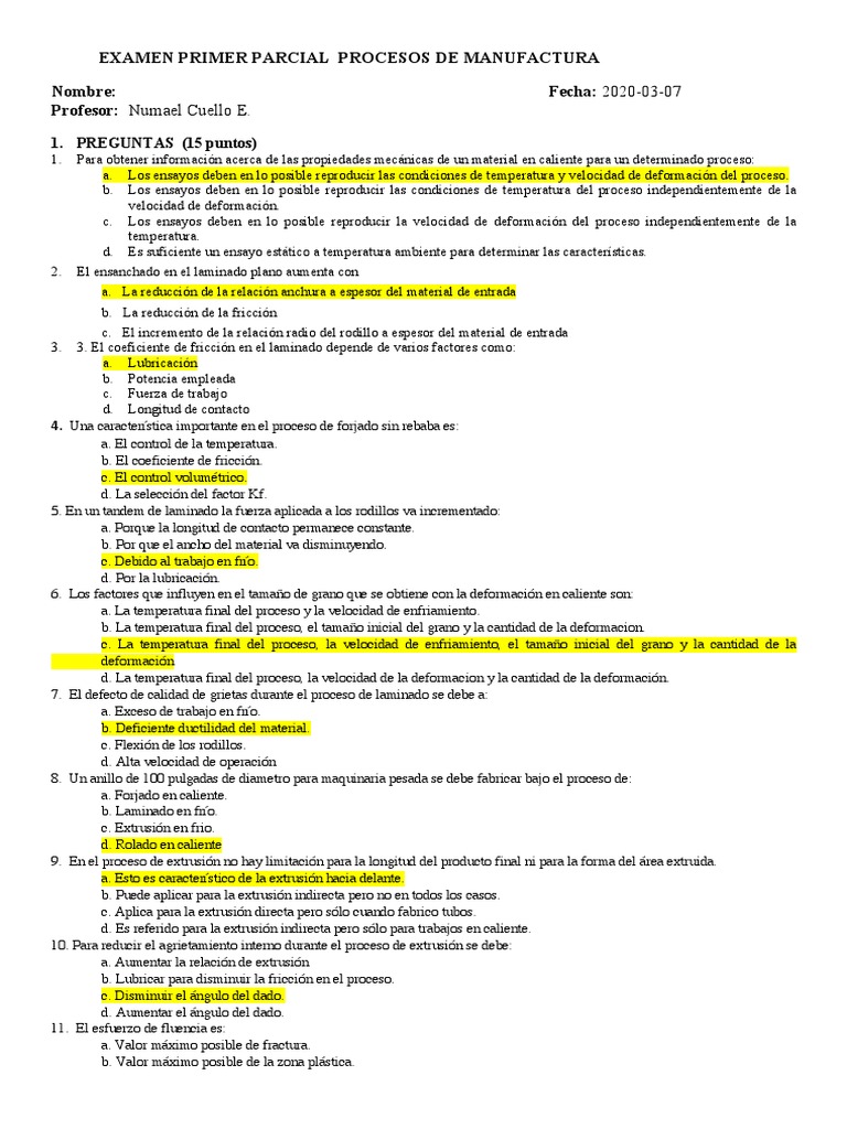 EXAMEN PRIMER PARCIAL PROCESOS DE MANUFACTURA