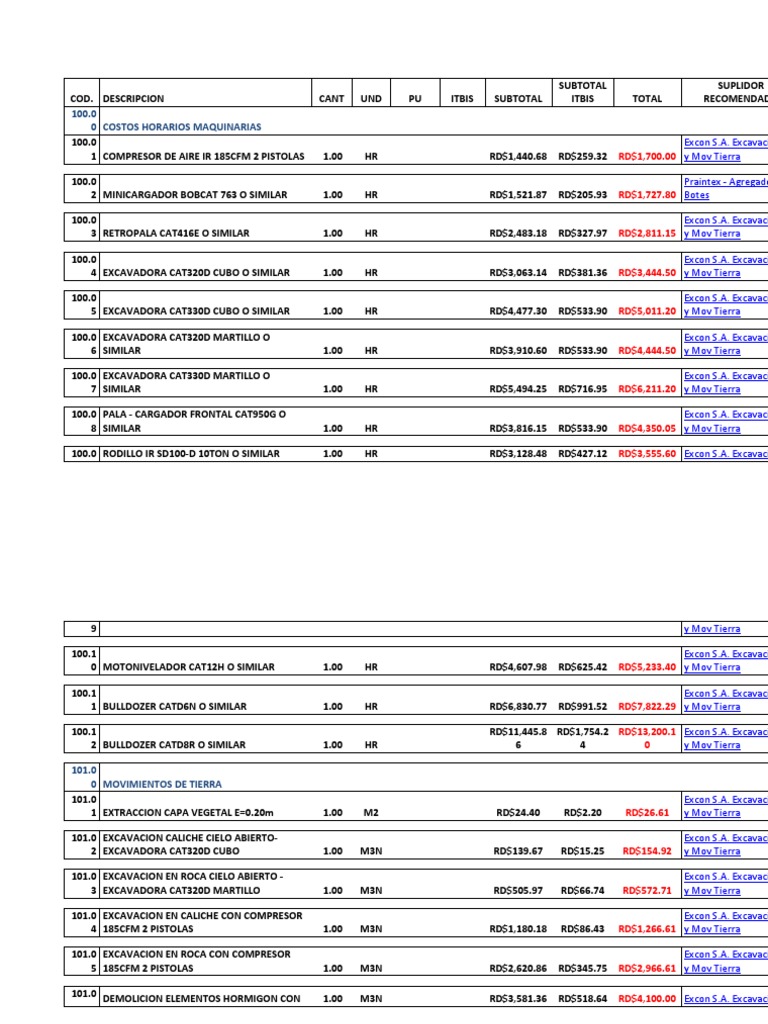 101.0 DEMOLICION ELEMENTOS HORMIGON CON 1.00 M3N RD$3,581.36 RD$518.64 RD$4,100.00 Excon S.A. Excavaci