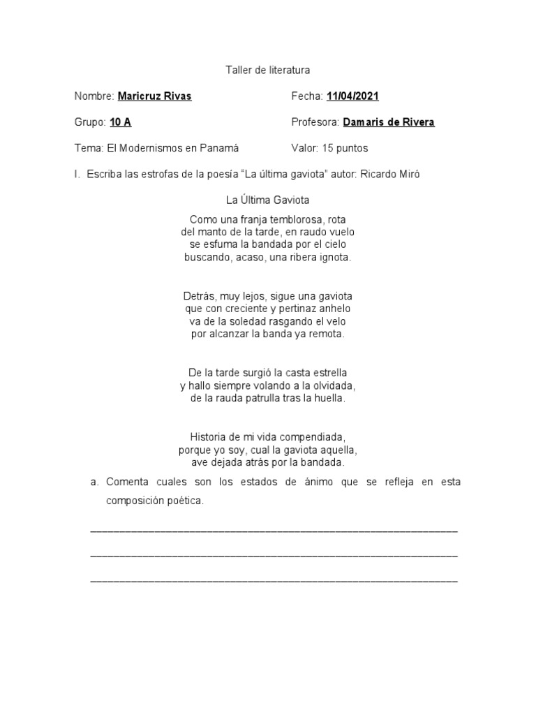 I. Escriba las estrofas de la poesía “La última gaviota” autor: Ricardo Miró