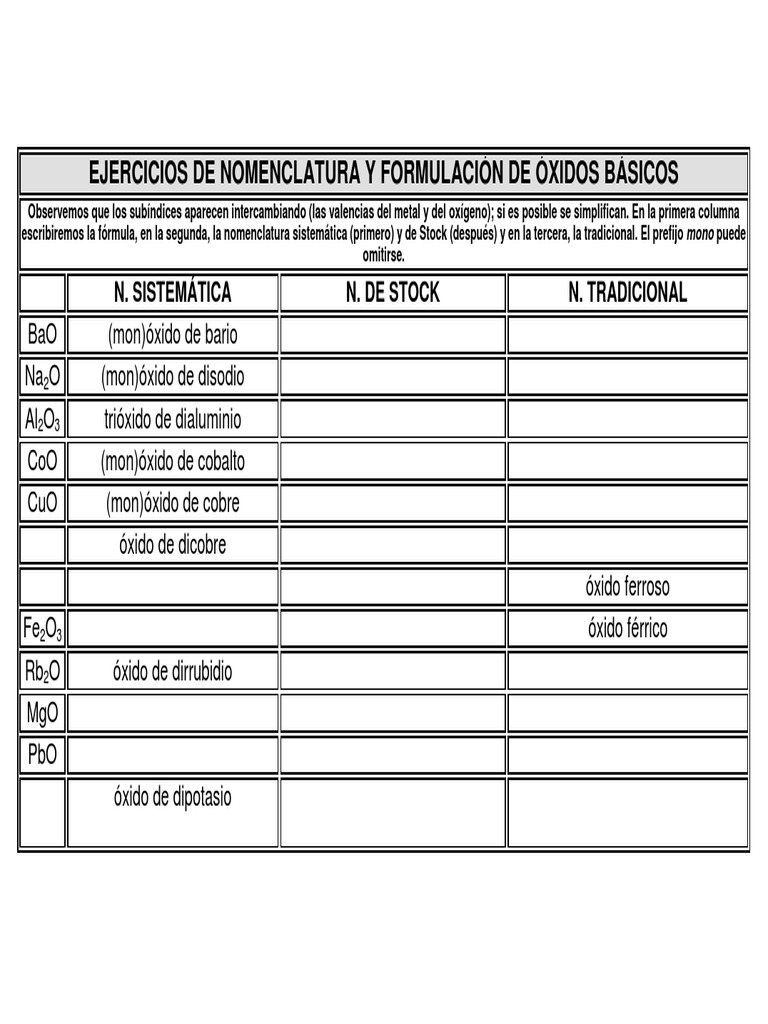 EJERCICIOS DE NOMENCLATURA Y FORMULACIÓN DE ÓXIDOS BÁSICOS
