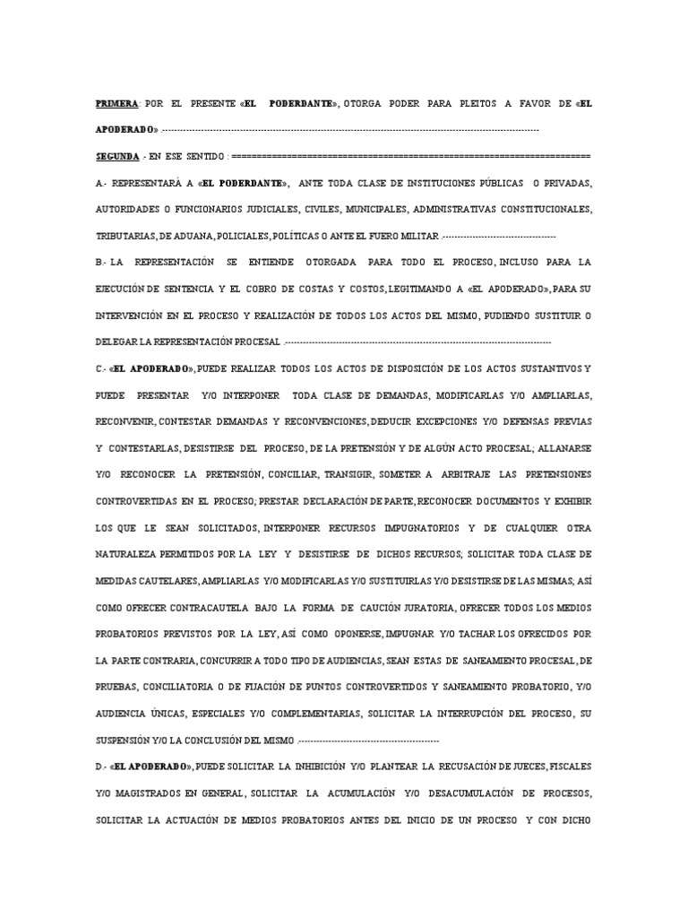 PRIMERA: POR EL PRESENTE «EL PODERDANTE», OTORGA PODER PARA PLEITOS A FAVOR DE «EL