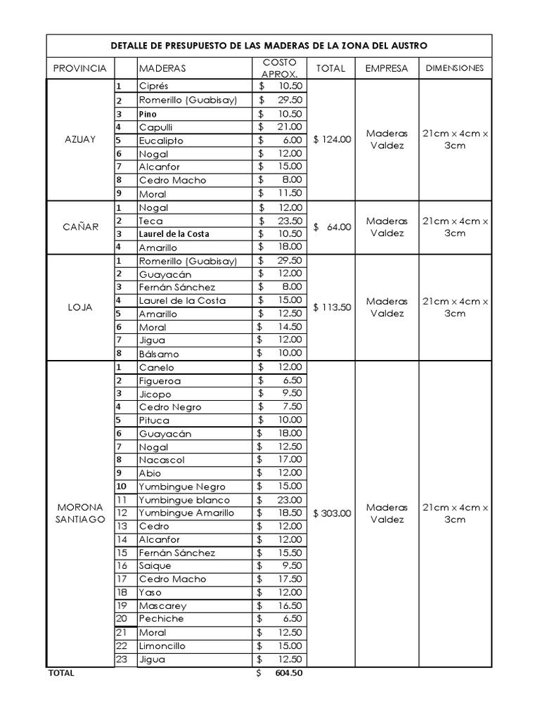 DETALLE DE PRESUPUESTO DE LAS MADERAS DE LA ZONA DEL AUSTRO