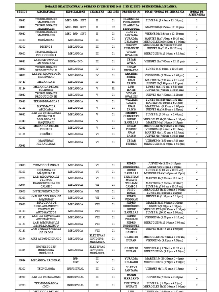 HORARIO DE ASIGNATURAS A OFERTAR EN SEMESTRE 2022 - I EN EL DPTO.