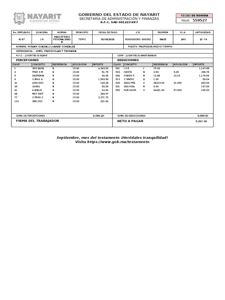 GOBIERNO DEL ESTADO DE NAYARIT RECIBO DE NOMINA