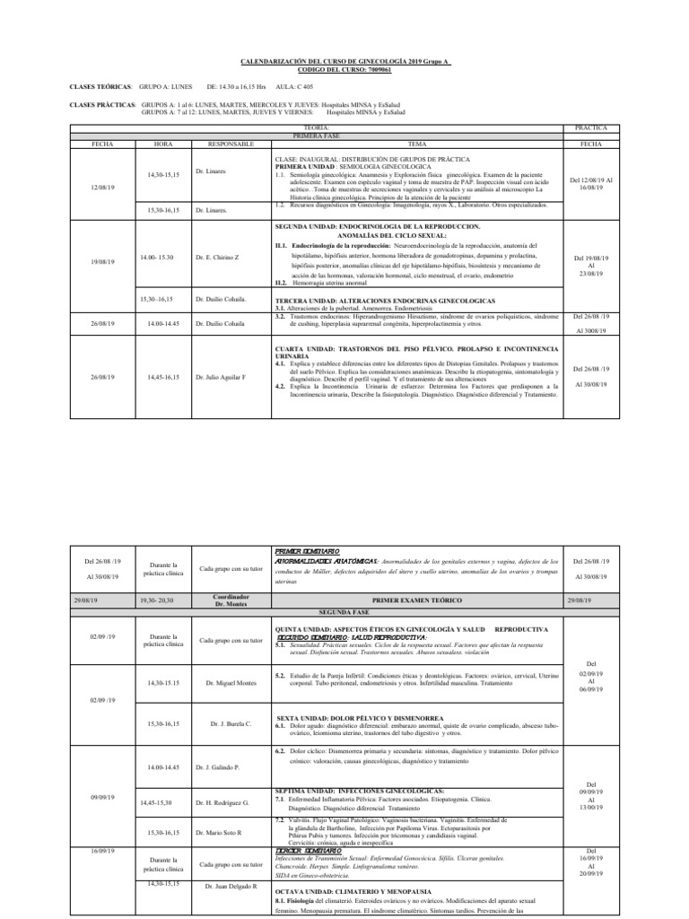 CALENDARIZACIÓN DEL CURSO DE GINECOLOGÍA 2019 Grupo A