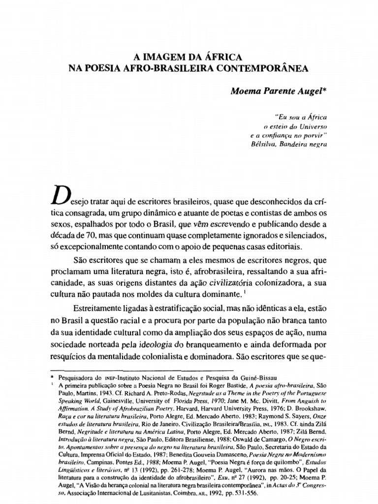 hru.vi1riro. Campinas. Pontes Ed., 1988; Moema P. Augel, "Poesia Negra é força de quilombo", Estudos