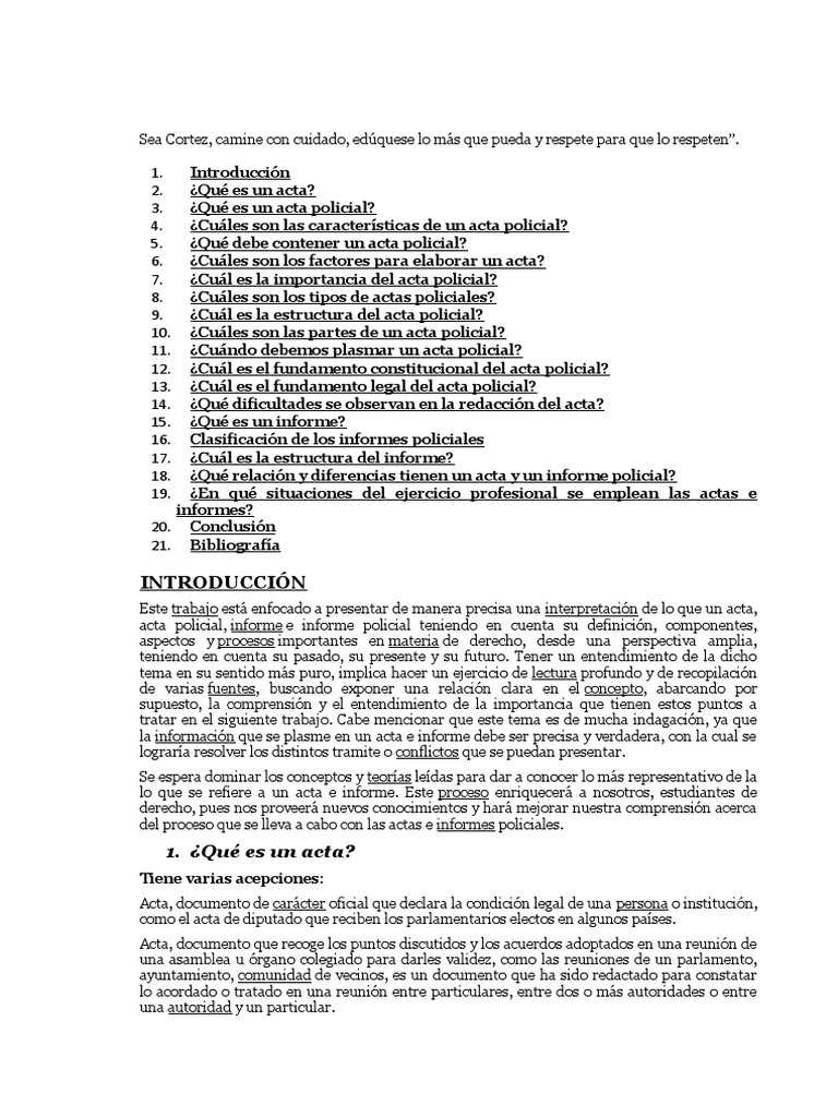 acta policial, informe e informe policial teniendo en cuenta su definición, componentes,