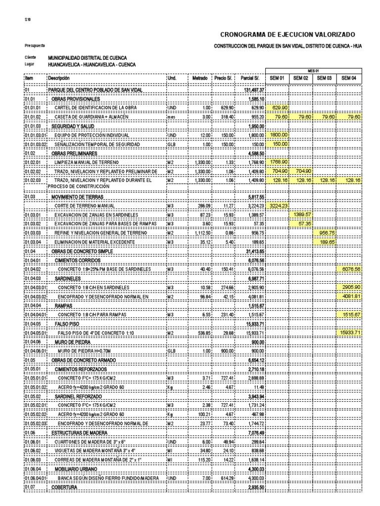 Item Descripción Und. Metrado Precio S/. Parcial S/. SEM 01 SEM 02 SEM 03 SEM 04