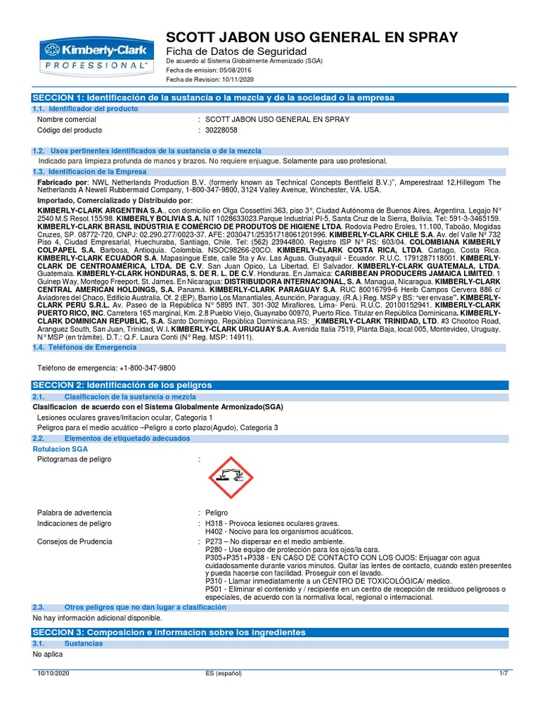 Fuentes de datos : Newell Brands. FISPQ - Jabón en aerosol de uso general Scott; 1 de octubre de 2019.
