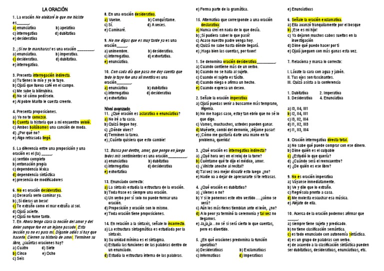 a) Cuatro d) Siete un enunciado. a) Desiderativas b) Exclamativas ser dubitativas, desiderativas, enunciativas, etc.