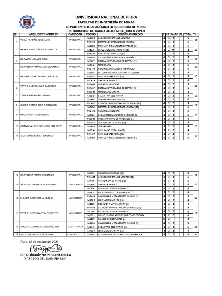 N° APELLIDOS Y NOMBRES CATEGORÍA CÓDIGO CURSOS ASIGNADOS C HT PA PC PL TOTAL TH