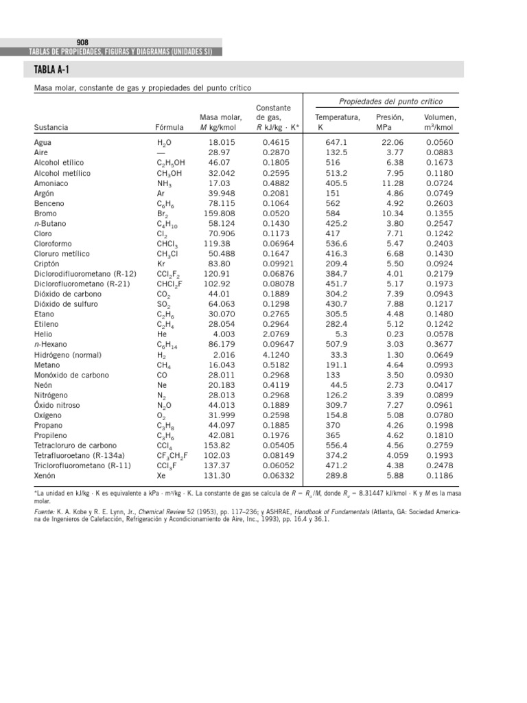 Fuente: K. A. Kobe y R. E. Lynn, Jr., Chemical Review 52 (1953), pp. 117–236; y ASHRAE, Handbook of Fundamentals (Atlanta, GA: Sociedad America-