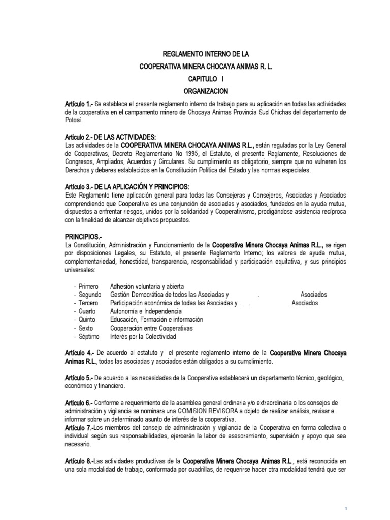 Artículo 4.- De acuerdo al estatuto y el presente reglamento interno de la Cooperativa Minera Chocaya