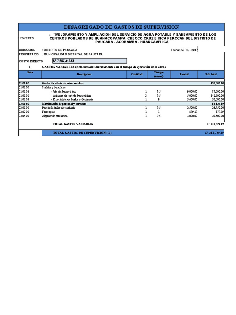 TOTAL GASTOS DE SUPERVISION ( I ) S/. 311,729.19