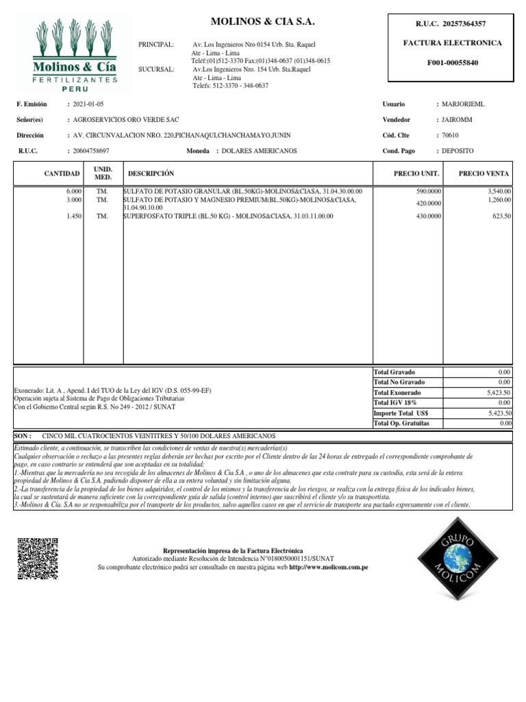 Señor(es) : AGROSERVICIOS ORO VERDE SAC Vendedor : JAIROMM