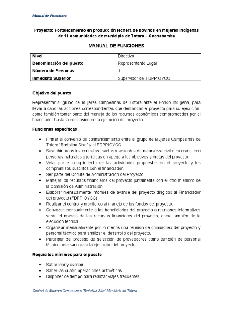 Representar al grupo de mujeres campesinas de Totora ante el Fondo Indígena, para