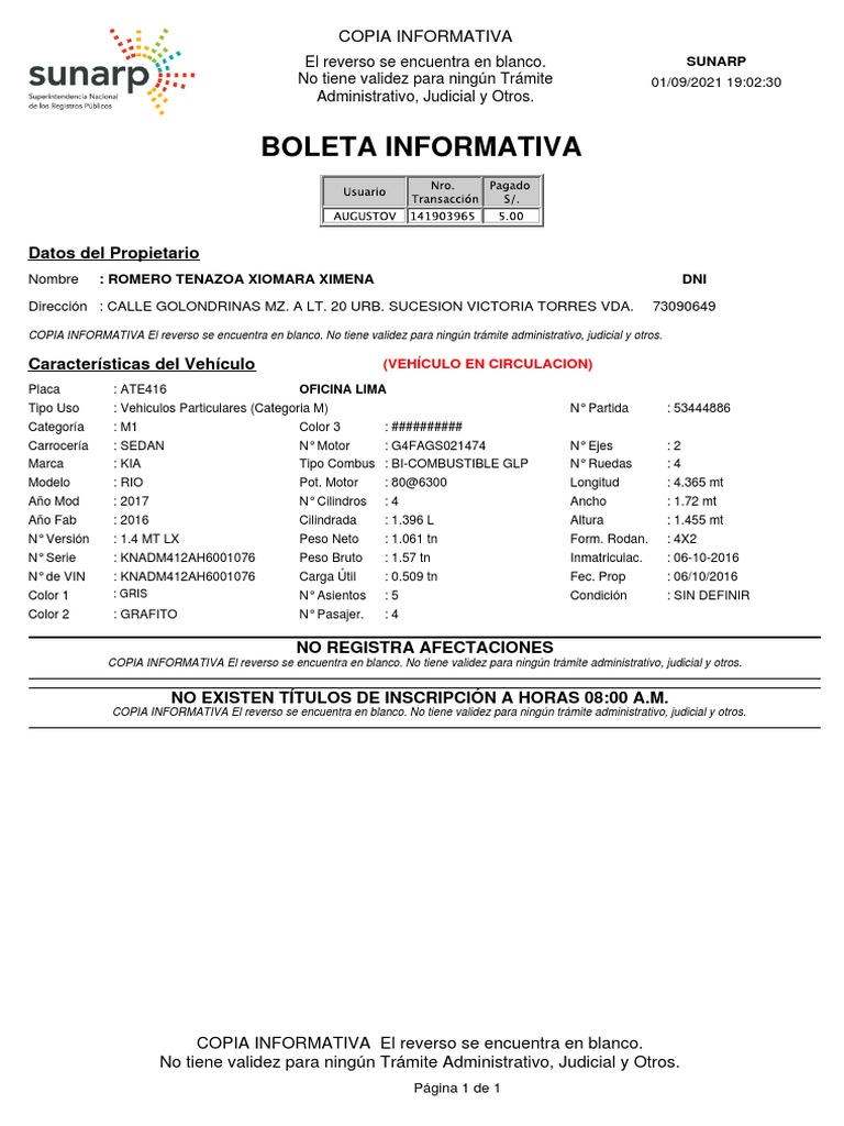 COPIA INFORMATIVA El reverso se encuentra en blanco. No tiene validez para ningún trámite administrativo, judicial y otros.