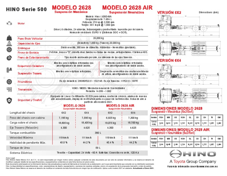 Hino Motors Sales México se reserva el derecho de modificar el contenido de ésta ficha técnica sin ningún tipo de notificación. Aplica a año modelo 2021 en adelante. Actualizado a Enero 2021.