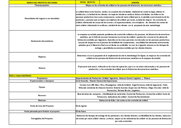 MARCO DEL PROYECTO SEIS SIGMA FECHA: 28/07/21 VERSIÓN