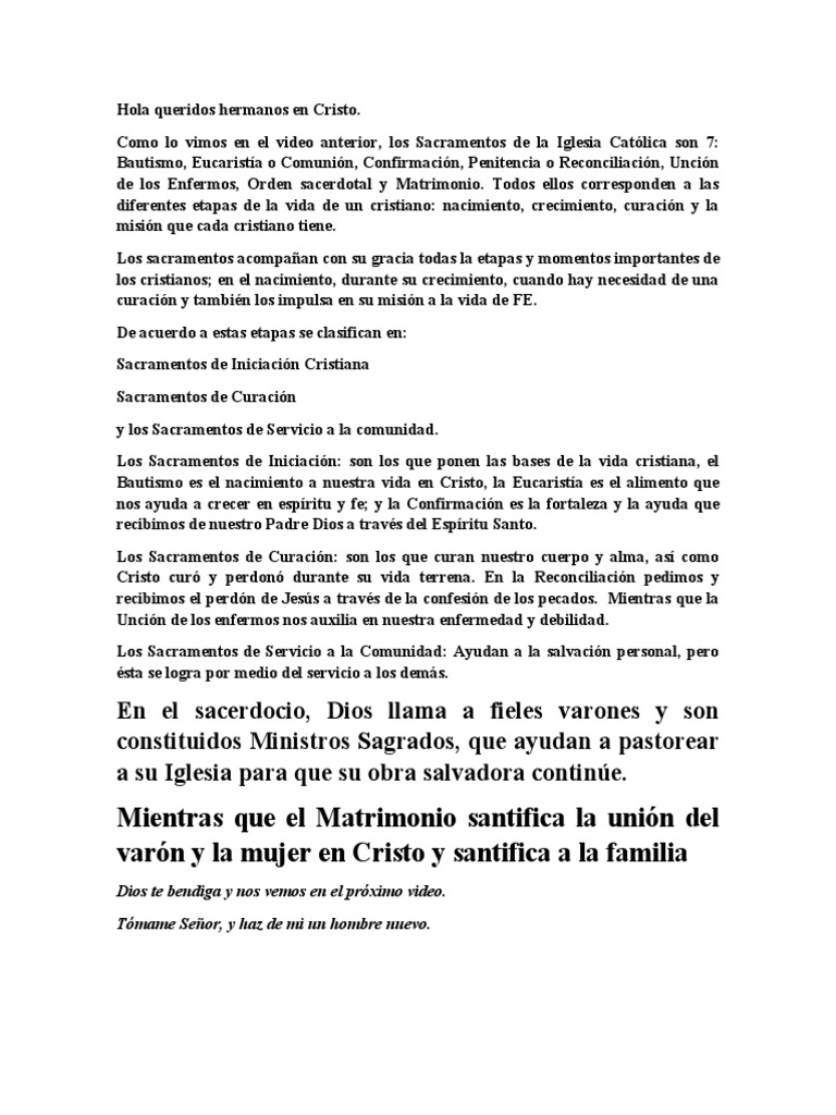 Como lo vimos en el video anterior, los Sacramentos de la Iglesia Católica son 7: