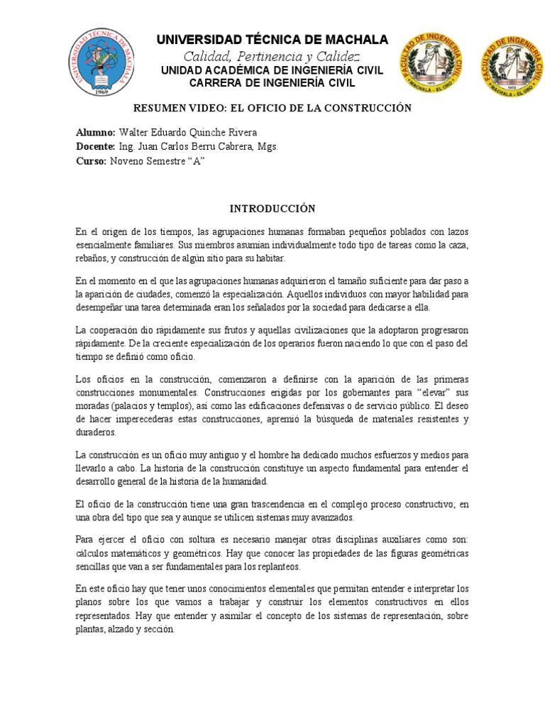RESUMEN VIDEO: EL OFICIO DE LA CONSTRUCCIÓN